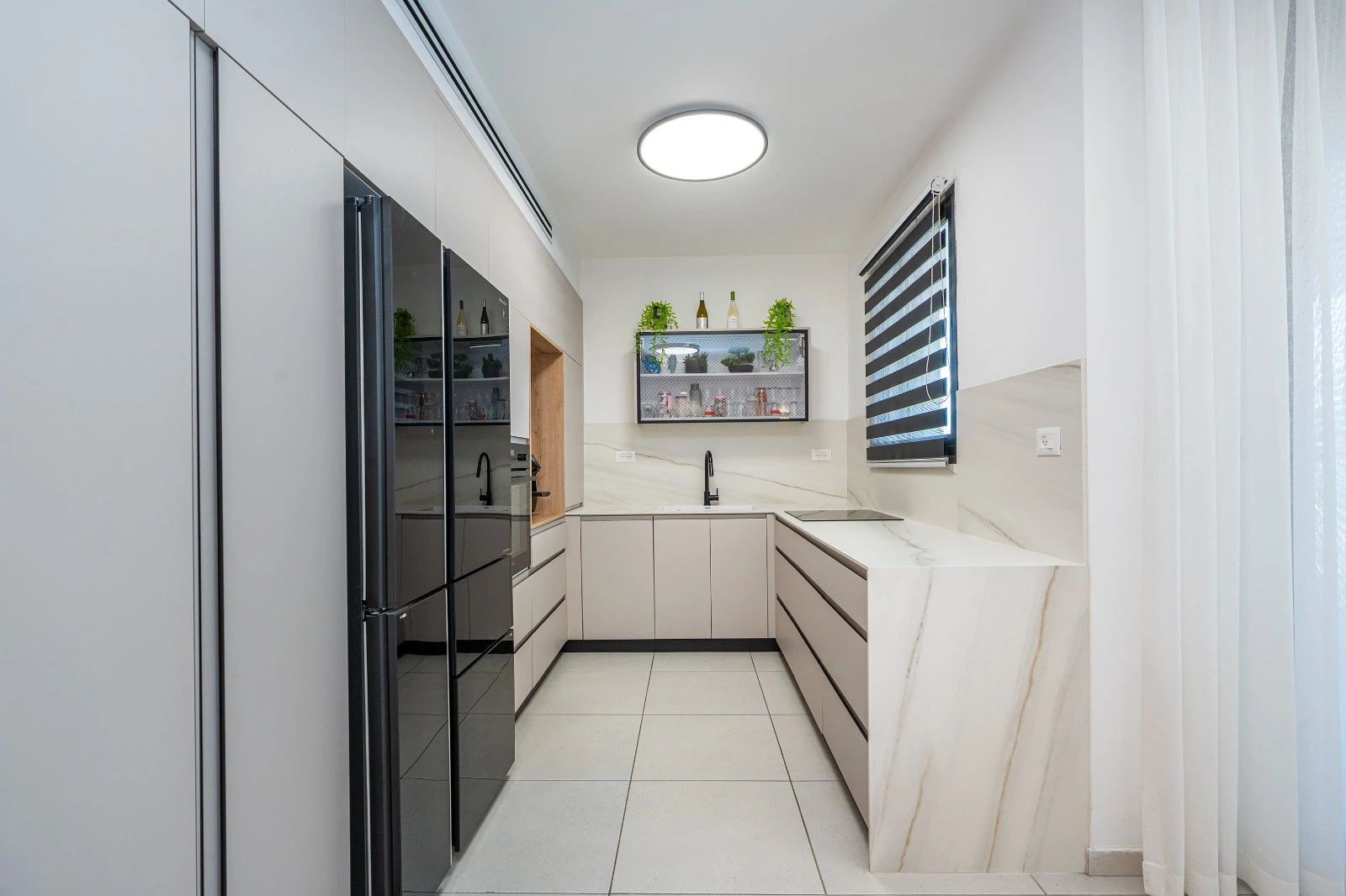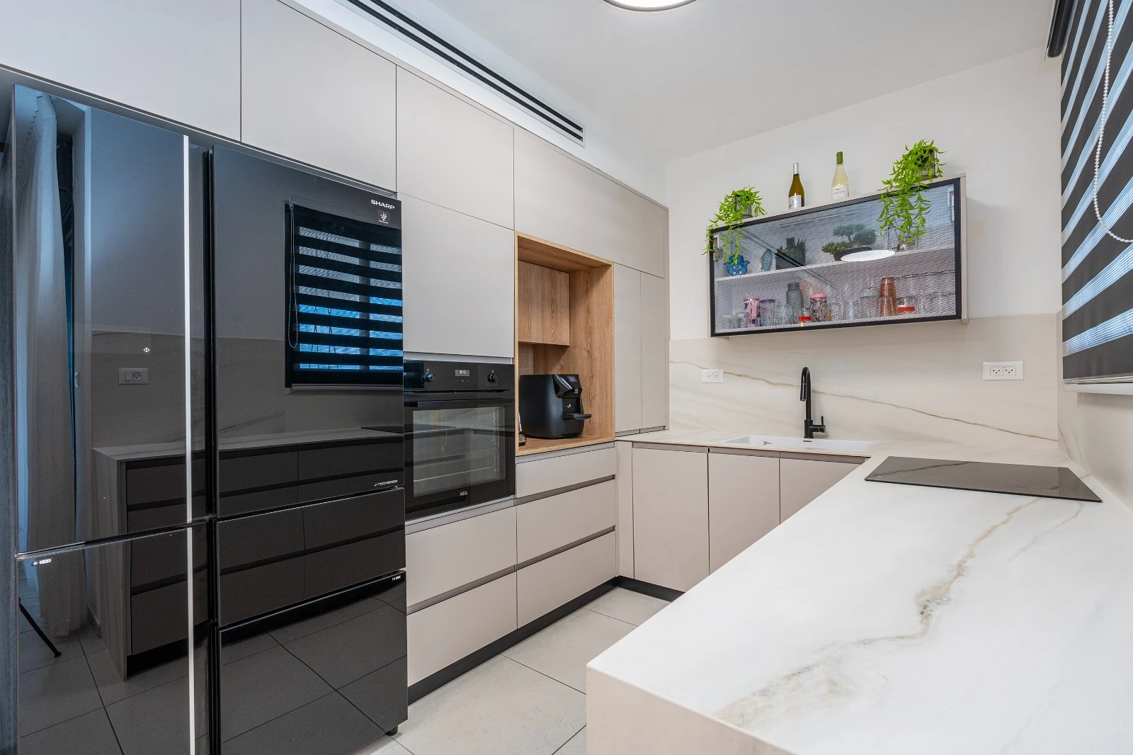הדירה נהנית ממטבח איכותי בנגרות בהתאמה אישית, ארונות קיר מותאמים לניצול מקסימלי של החלל, סורגי בטיחות בכל הדירה