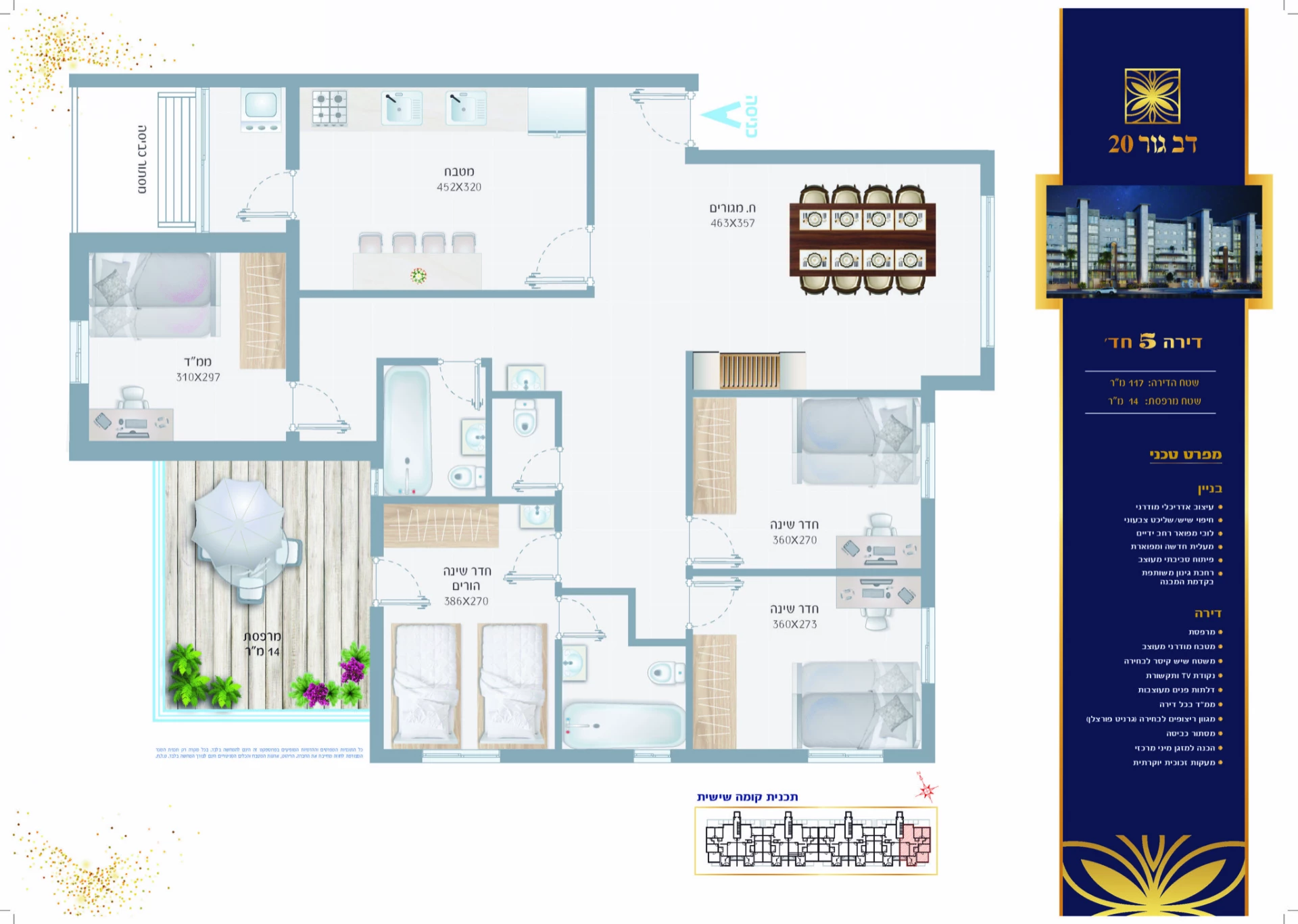 ברוכים הבאים לדירת 4 חדרים המהממת שלנו! בגודל של 117 מ"ר ומרפסת שמש פורחת בגודל של 14 מ"ר, זו דירה שלא תרצו לפספס. מטבח מודרני ומעוצב יתן לכם את התחושה שאתם במסעדה מפוארת, והמשטח המרשים עשוי שיש קיסר לבחירתכם. הדלתות הפנימיות מעוצבות והמגוון הרחב של ריצופים שלנו יתאים לכל טעם. יש גם מרפסת שירות והכנה למזגן מיני מרכזי כדי להבטיח לכם נוחות בכל עונה. המעקות היוקרתיות והלובי המפואר רחב הידיים יוסיפו לתחושת היוקרה והנוחות שלכם בדירה. אל תחמיצו את ההזדמנות הזו להתחיל את החיים החדשים שלכם בדירה מהממת הזו!